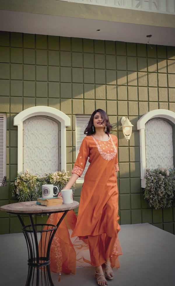Step into timeless elegance with this stunning rust orange kurta set, designed to blend tradition with modern charm. The straight-cut kurta features delicate floral embroidery around the neckline and sleeves, adding a refined handcrafted touch. Paired with matching tailored pants, the look is elevated by a sheer, flowy dupatta adorned with intricate embroidered borders that enhance its graceful appeal.