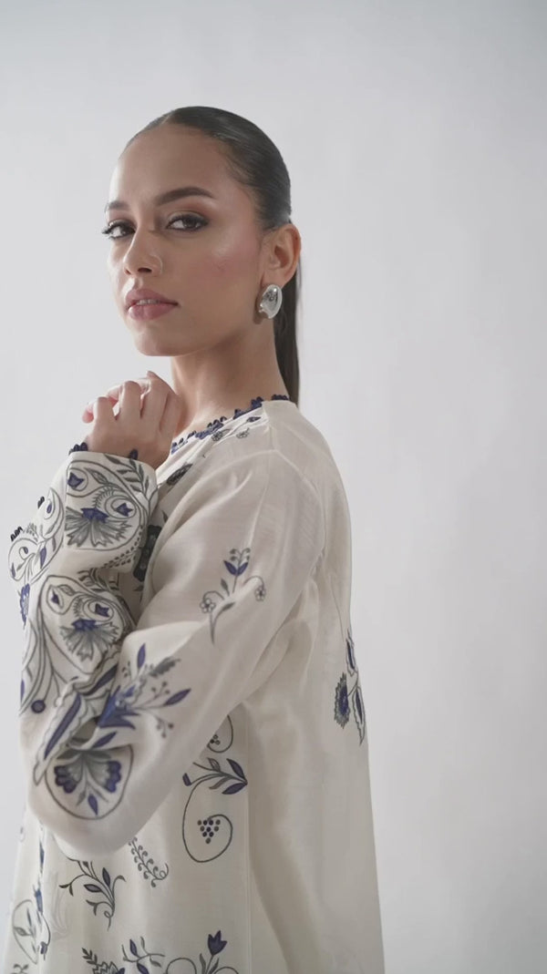 Crafted in a soft, breathable fabric, this kaftan features delicate blue floral motifs on a serene ivory base. The relaxed silhouette and flowing sleeves offer effortless comfort while maintaining a refined, graceful look—perfect for everyday elegance and understated sophistication.